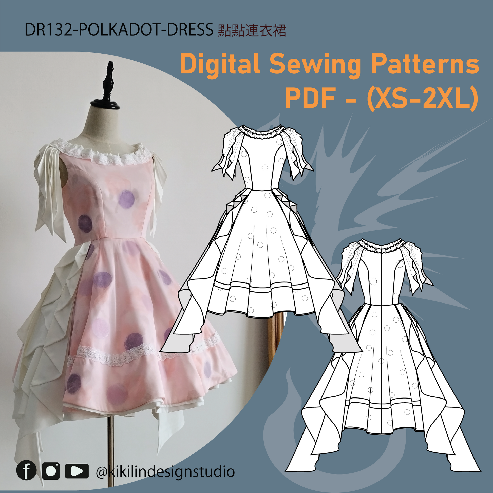 This dramatic dress pattern features a fitted bodice, a playful polkadot skirt, and romantic, layered trim details (like the back draping and neckline ruffles). It's perfect for cosplay, Lolita fashion, or historical-inspired fantasy events.